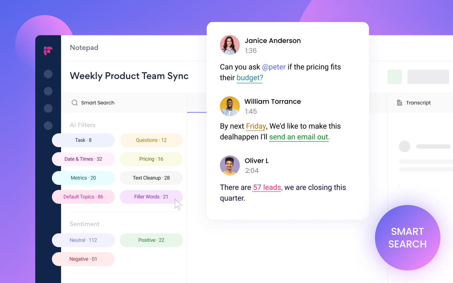 - Searchable Meeting Intelligence Across All History: Every word from every recorded meeting is indexed and searchable. Full-text search across all meeting history: search ‘Q3 pricing discussion’ and find the exact moment in the correct meeting where pricing was discussed, with transcript context and a playback link to that exact timestamp. Topic-based search surfaces all meetings where specific subjects were discussed. Speaker search finds every meeting where a specific person spoke. For organizations with months or years of Fireflies history, this creates a searchable institutional memory that is impossible to build manually.