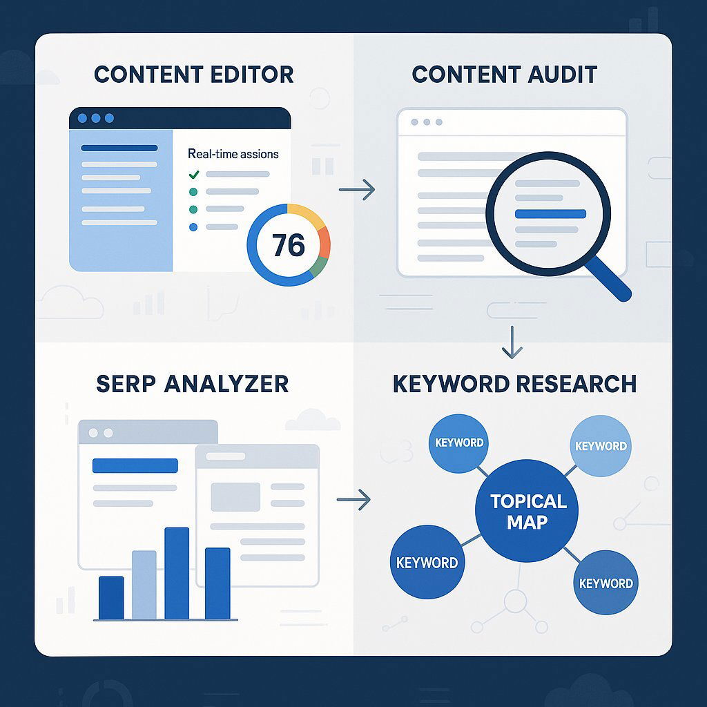 • Keyword Research and Topical Map: Built-in keyword research showing search volume, keyword difficulty, and SERP competition for any term. The Topical Map feature is strategically important: it clusters all keywords semantically related to your primary topic and shows which content clusters you need to publish to build topical authority. Google’s Helpful Content system rewards comprehensive topical coverage — the Topical Map shows you the full content roadmap to establish authority in your niche.